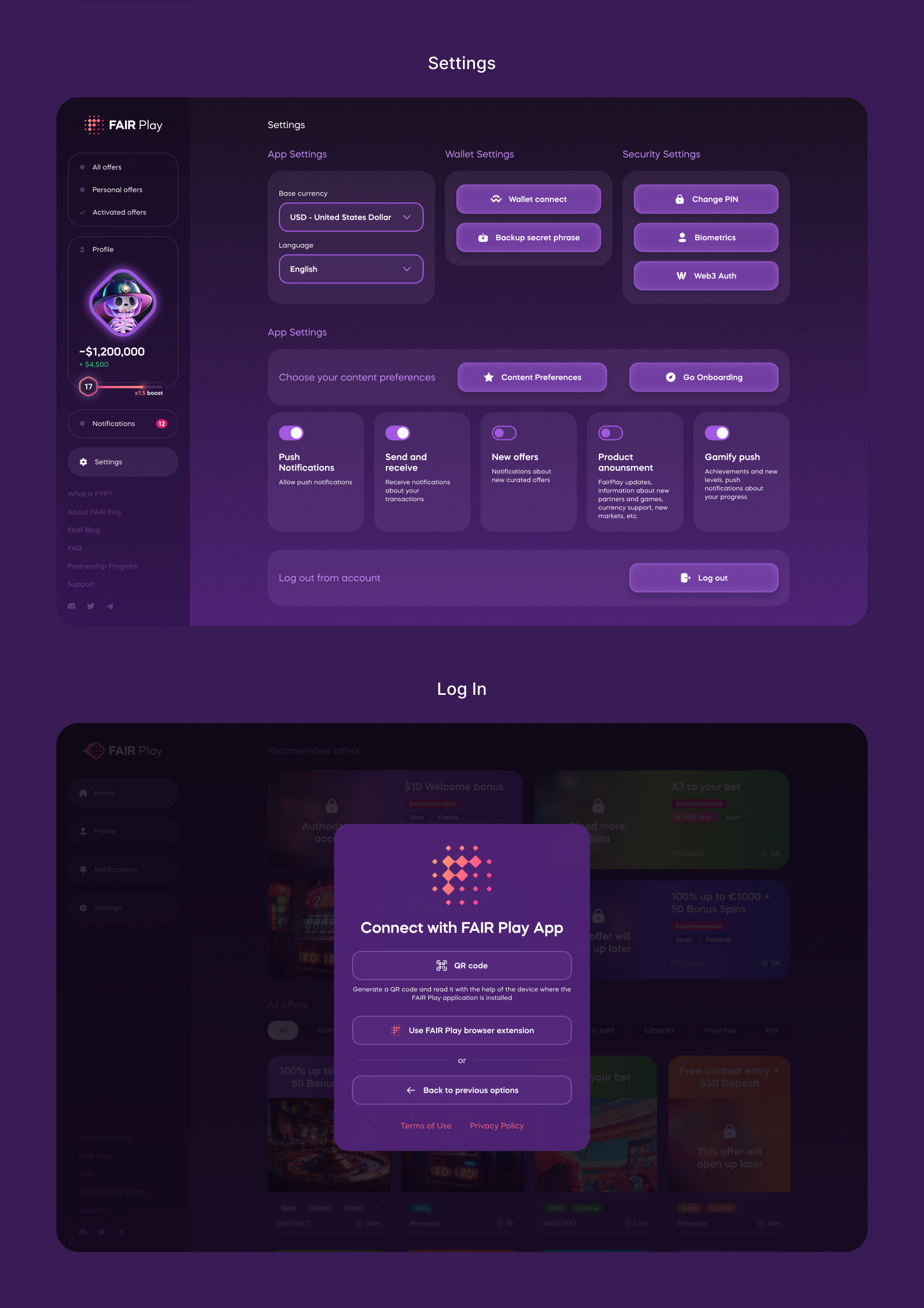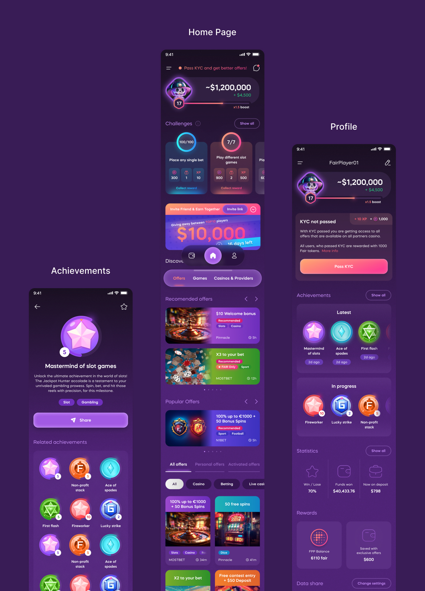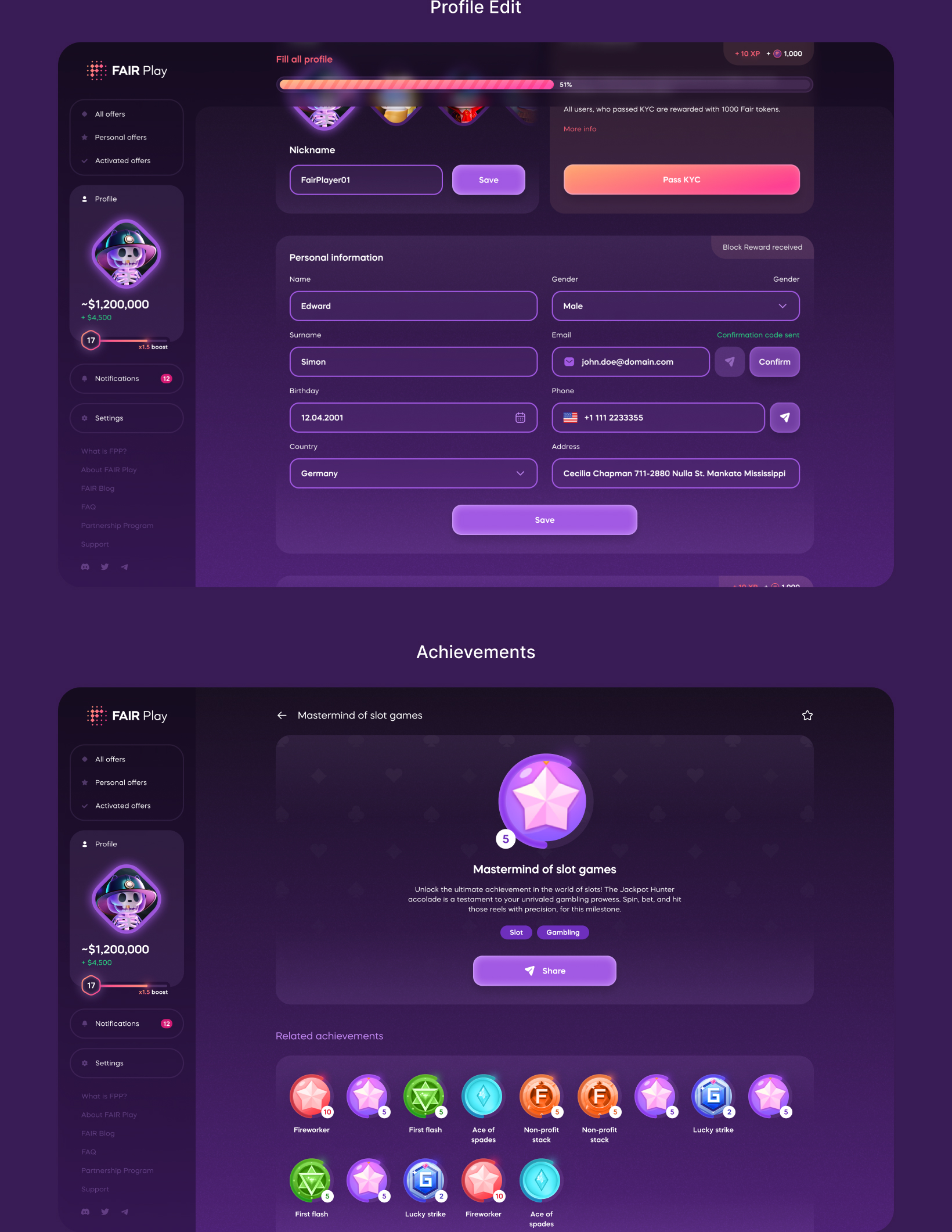 The primary accent color was chosen from the FairPlay logo, and the secondary color from the FairProtocol logo, with a neutral violet chosen for the background. This color coding was also applied to achievements, as well as daily, weekly, and monthly quests.