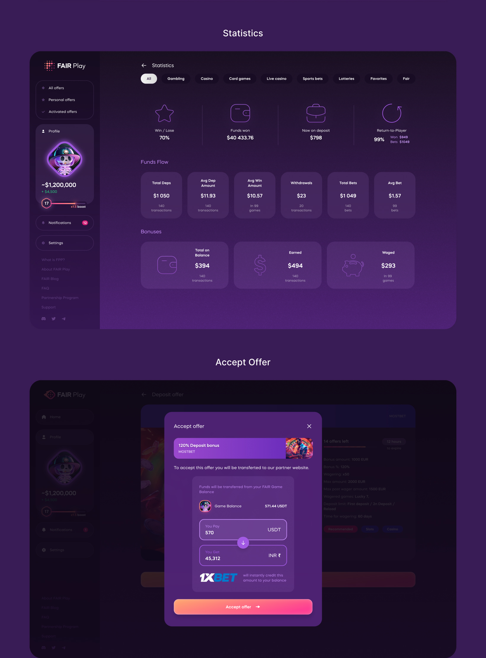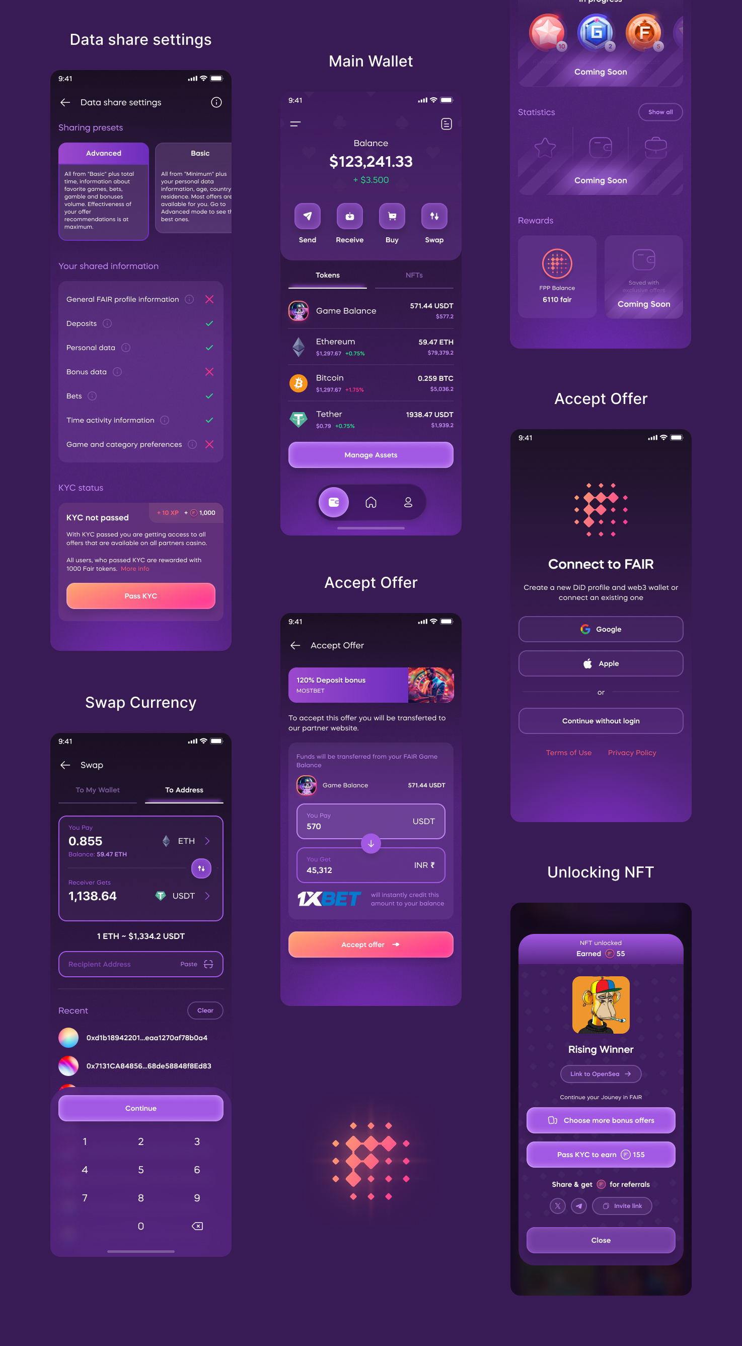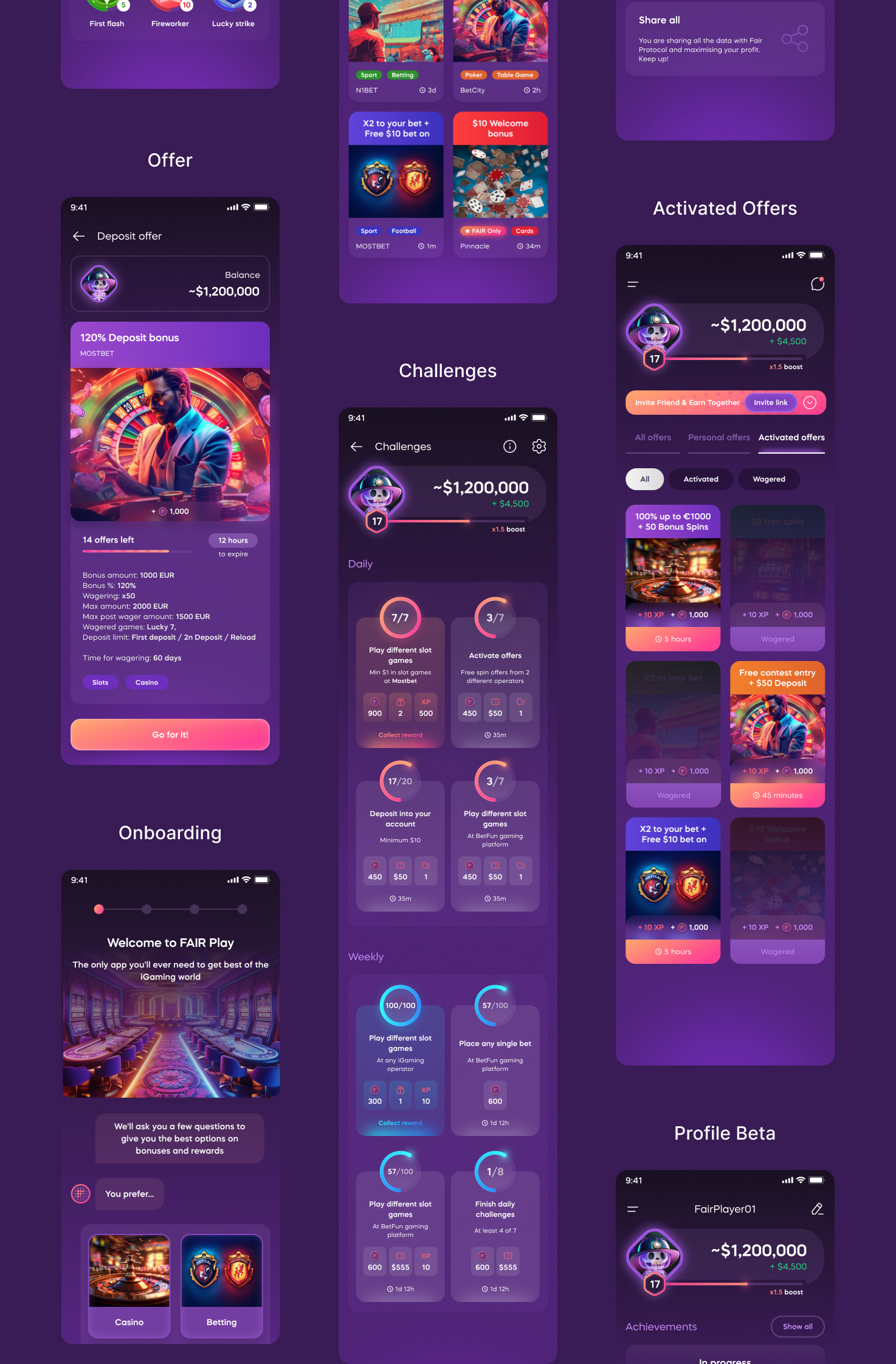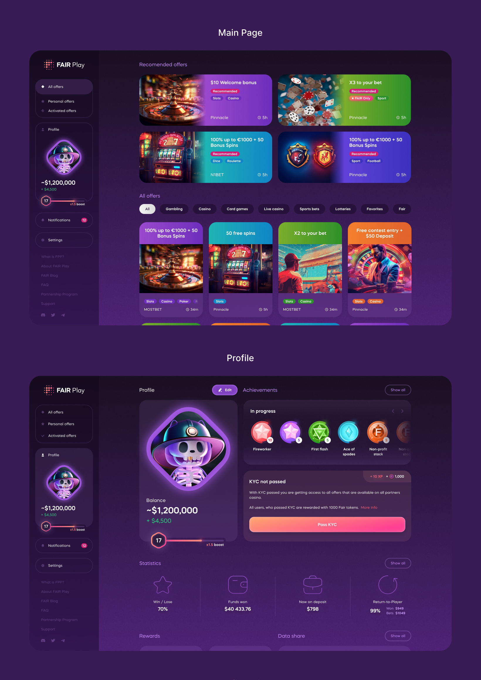 The primary accent color was chosen from the FairPlay logo, and the secondary color from the FairProtocol logo, with a neutral violet chosen for the background. This color coding was also applied to achievements, as well as daily, weekly, and monthly quests.