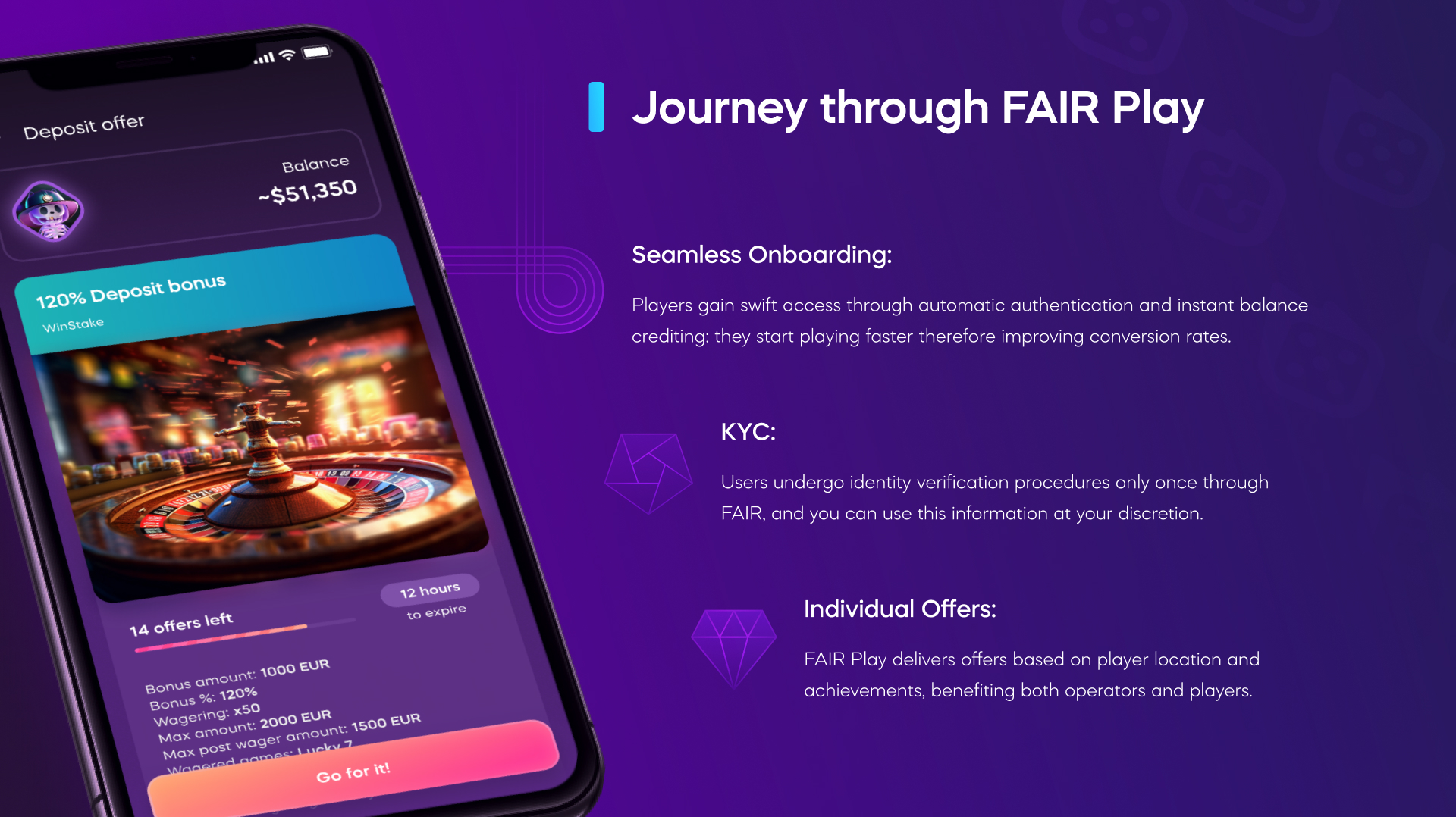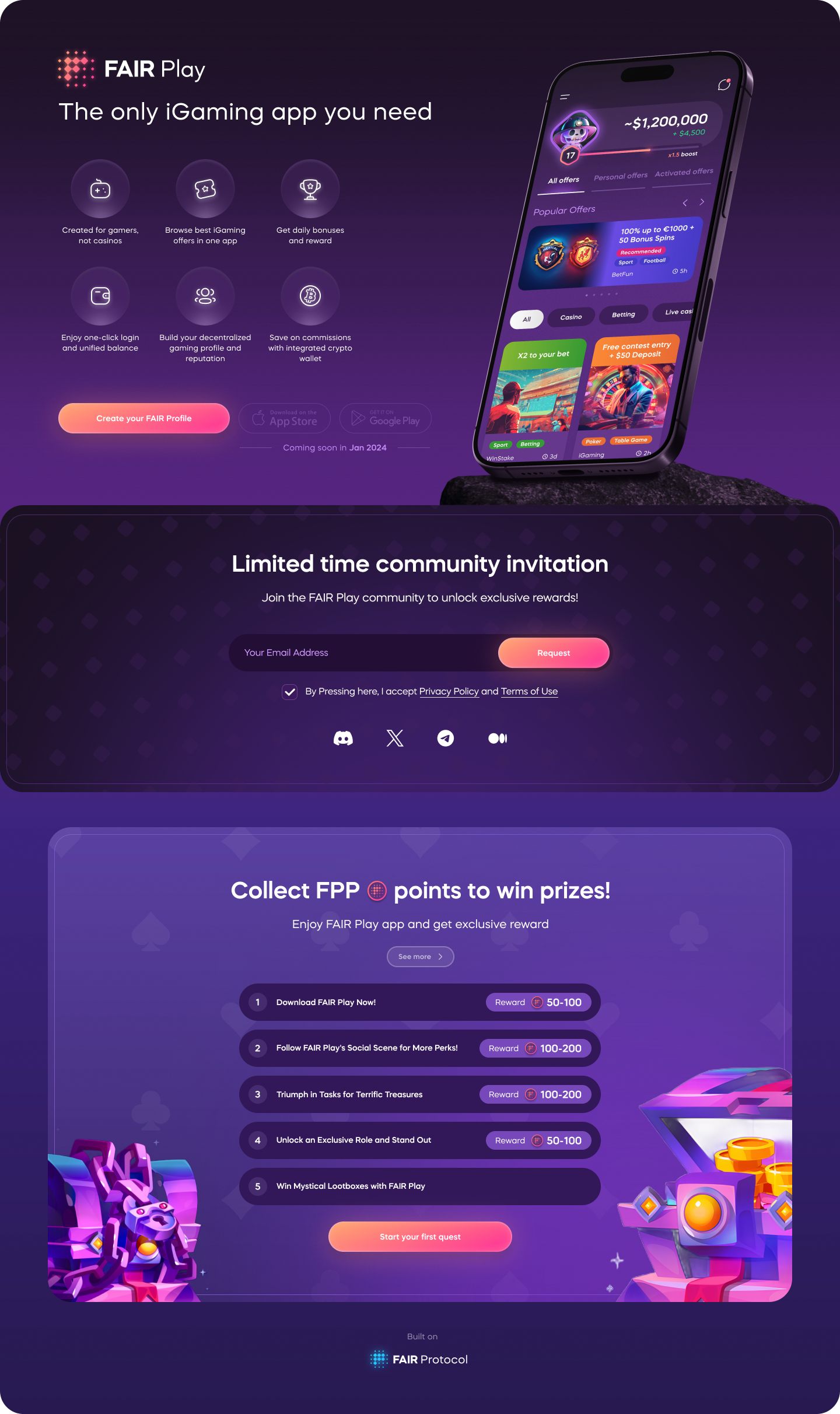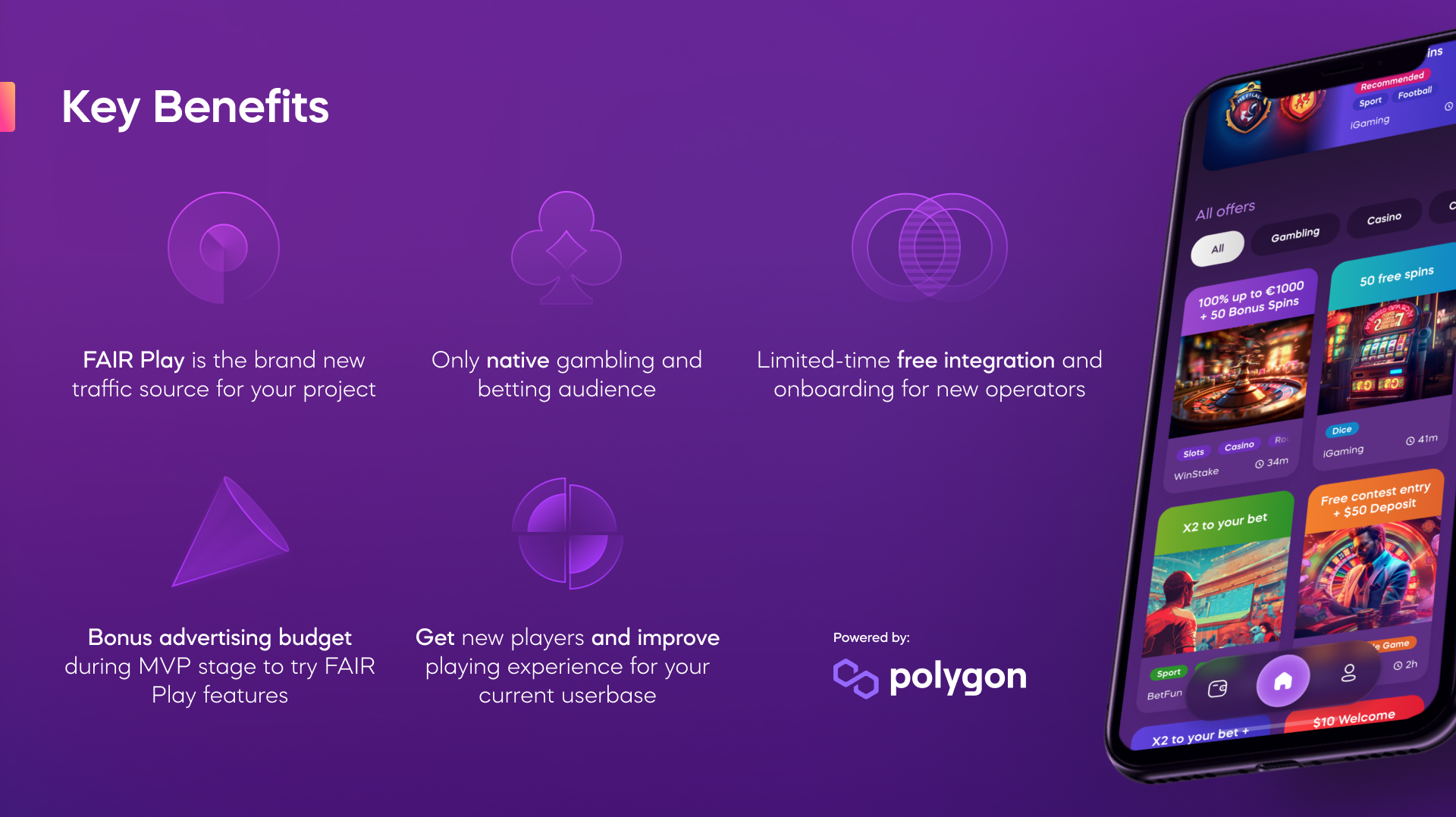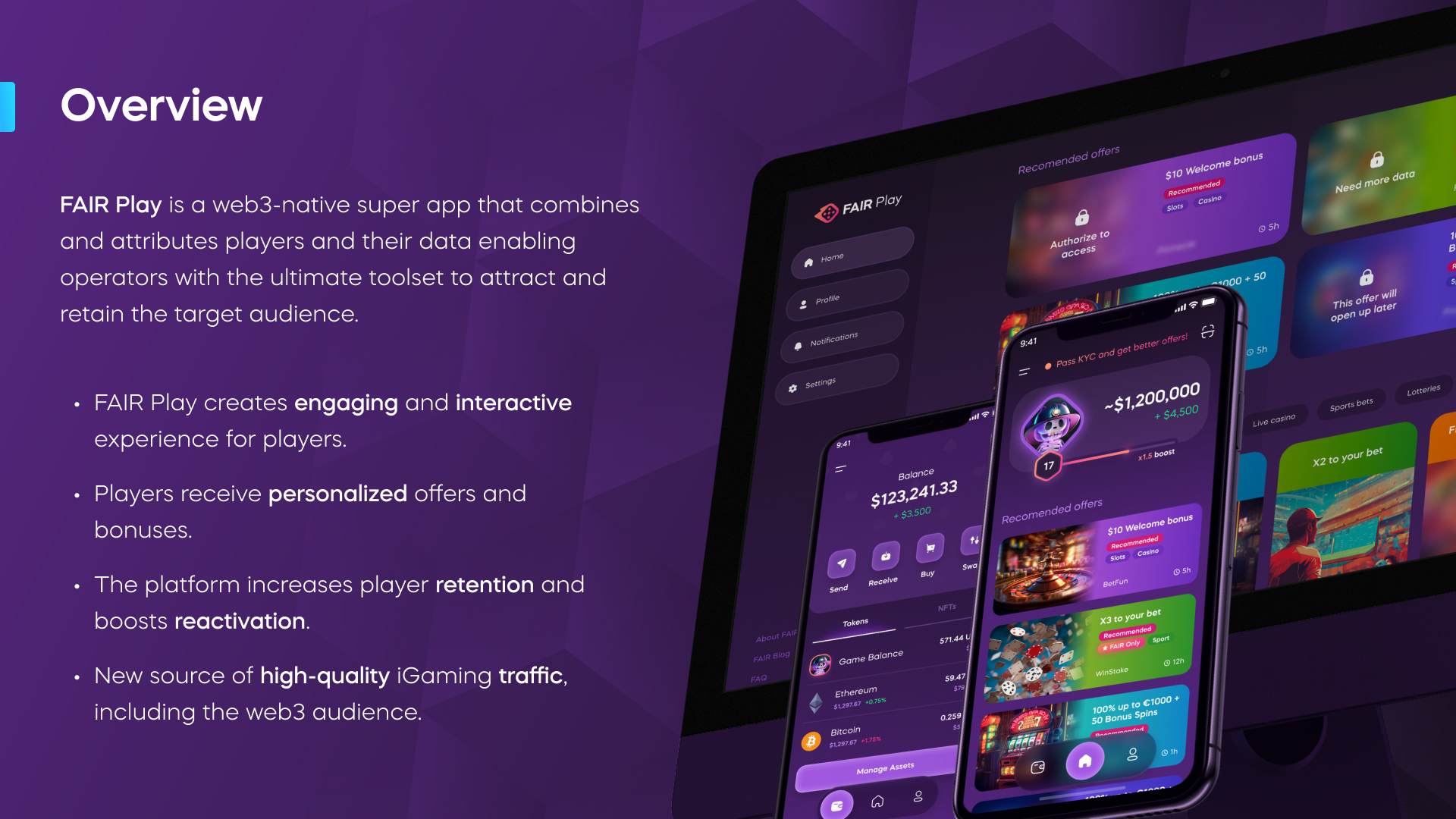 FAIR Play is a Web3 and blockchain-based platform that allows integration with bookmaking (betting) companies to attract their users through bonuses and completed tasks. This approach helps maintain greater interest and a higher user retention rate.