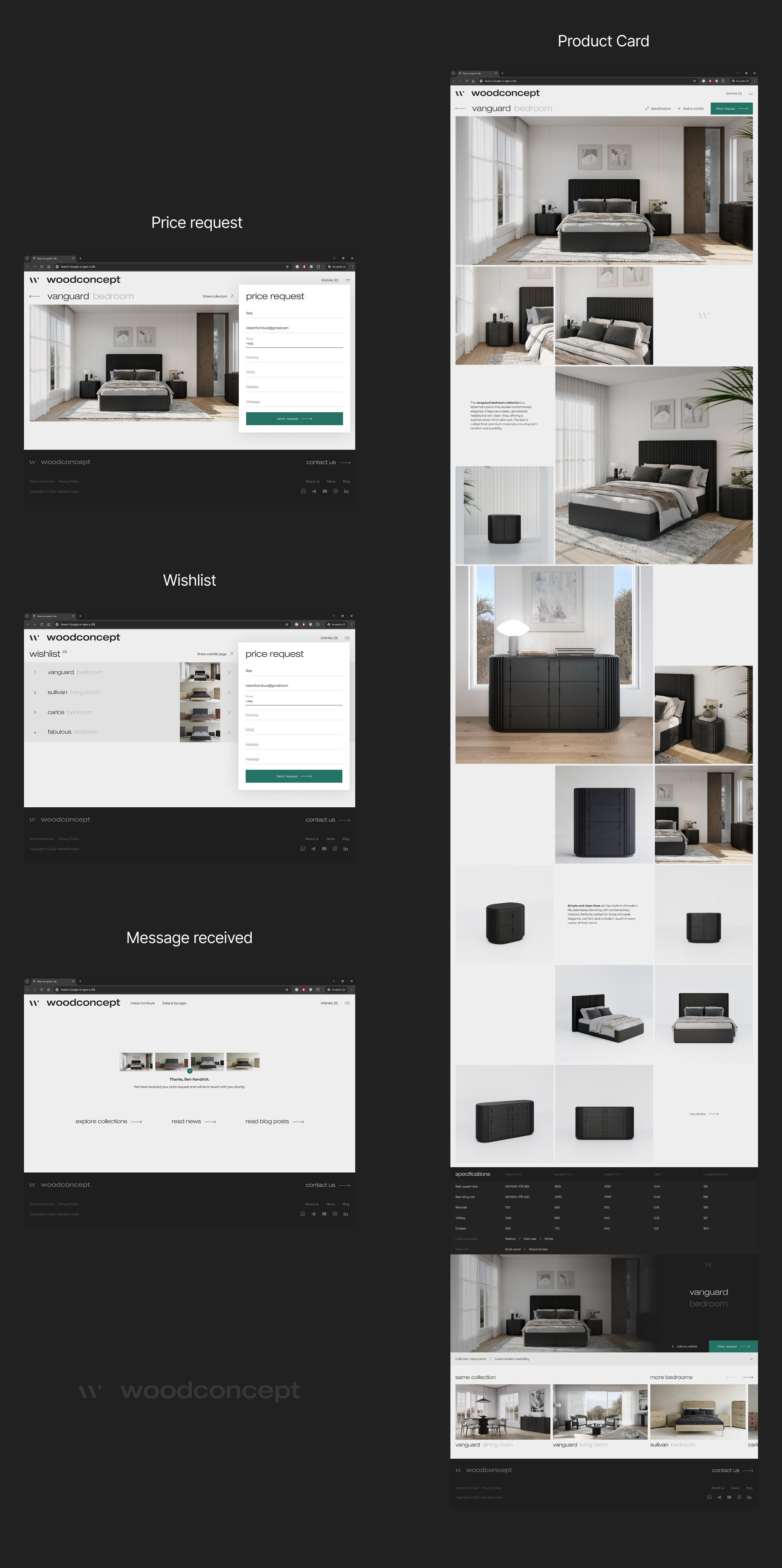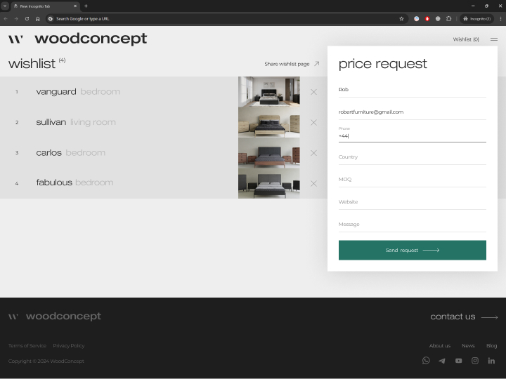 The primary objective was to strategically position conversion points and motivate visitors to submit an inquiry. In addition to standard pages featuring conversion-focused buttons, we introduced a “Wishlist” feature, allowing visitors to compile their favorite collections and submit a single inquiry for all selected items.