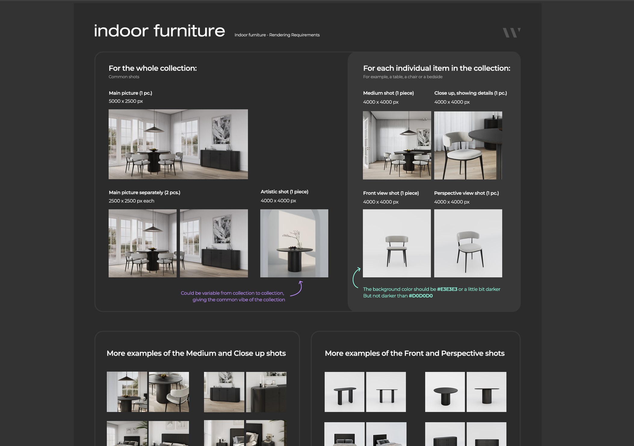 To preserve long-term visual consistency, I created a comprehensive style guide specifying standards for all furniture renderings that content managers upload.